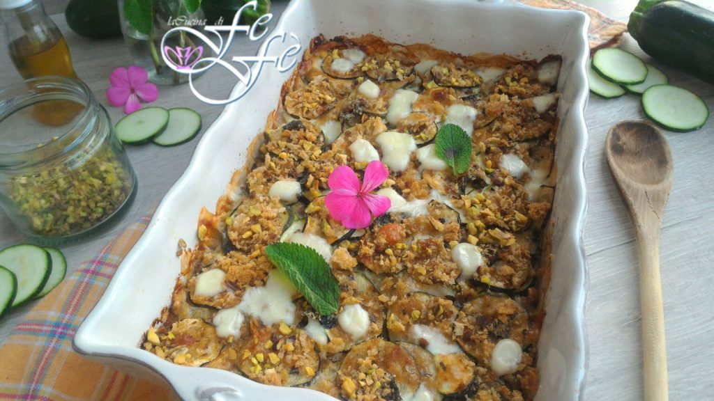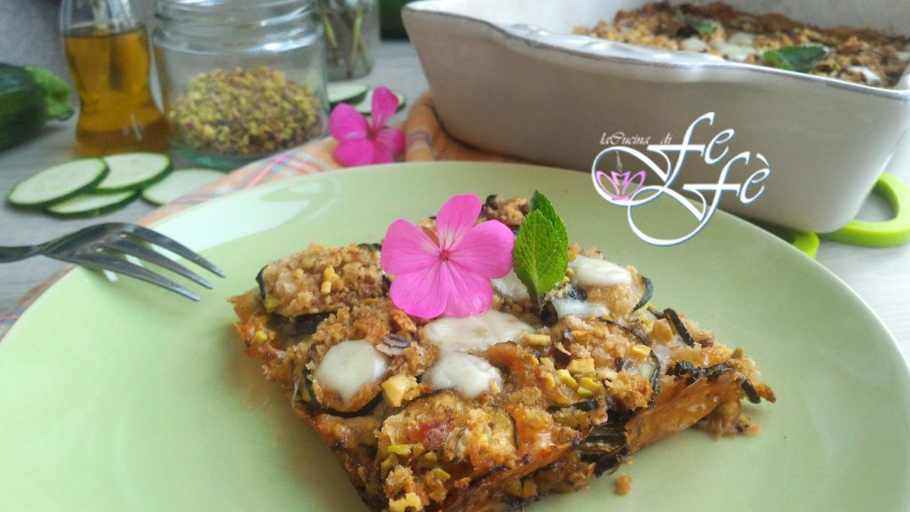Als u nog nooit de courgetteversie van de parmigiana hebt geprobeerd, is dit het moment om het uit te proberen! In werkelijkheid is dit een tweede versie, even lekker als zijn tegenhanger en zomerser parmigiana van courgettes in paprika en Griekse feta crème die ik afgelopen zomer maakte en die ik u ten zeerste aanbeveel om uit te proberen! Bovendien is het echt eenvoudig en snel als je bedenkt dat alle ingrediënten rauw in de ovenschaal worden samengesteld. Dus geen gefrituurd voedsel, maar een lichte en gezonde schotel. Bovendien, vergeleken met de eerste versie, heb ik gekozen voor een delicatere combinatie door een zachte kaas zoals provolone toe te voegen en een vleugje Siciliaanse smaak en knapperigheid te geven door tussen elke laag en in de uiteindelijke paneerlaag wat gehakte Bronte-pistachenoten te strooien! Het is perfect, eenmaal afgekoeld, in blokjes gesneden en geserveerd als voorgerecht bij een informeel buffet of als vegetarisch hoofdgerecht. Probeer beide versies en laat me weten welke je het lekkerst vond!