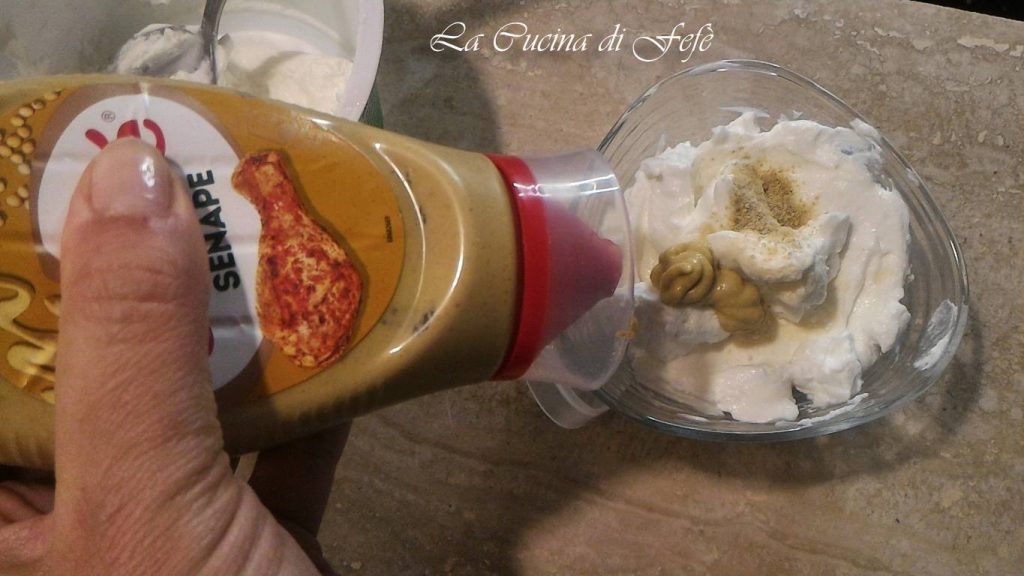 • Voeg ook de mosterdpoeder en de mosterd in saus toe en blijf mengen met een lepel.