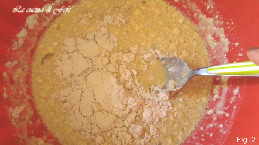 Zodra de gist goed is opgelost, voeg ook de suiker toe, het ei op kamertemperatuur, en het amandelextract en begin te mengen. Voeg dan een snufje zout toe en voeg de twee bloemsoorten beetje bij beetje toe, terwijl je aanvankelijk blijft mengen met een lepel (fig. 2).