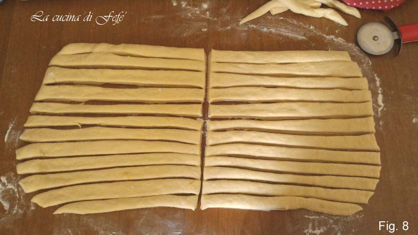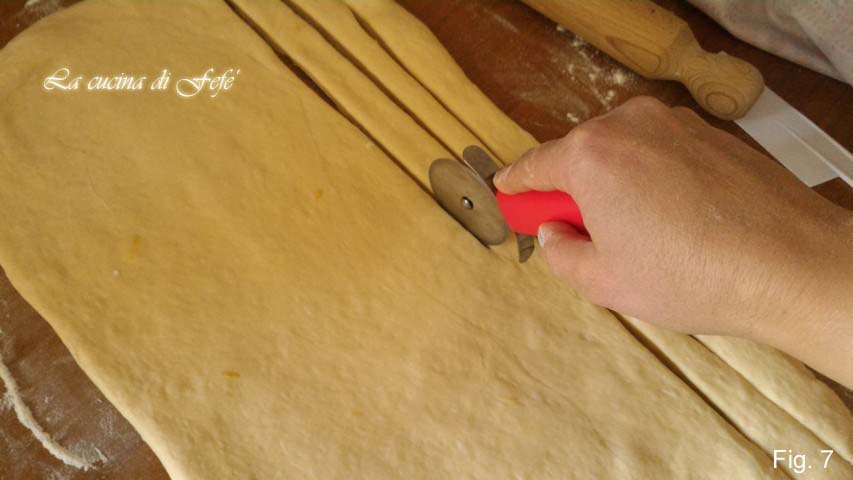 Na de rijstijd, neem het deeg en rol het uit op een licht bebloemd oppervlak met behulp van een deegroller. Je moet een rechthoekig vel van ongeveer 1 cm dikte verkrijgen. Snijd dan met een pizzasnijder 12 horizontale stroken (fig. 7).