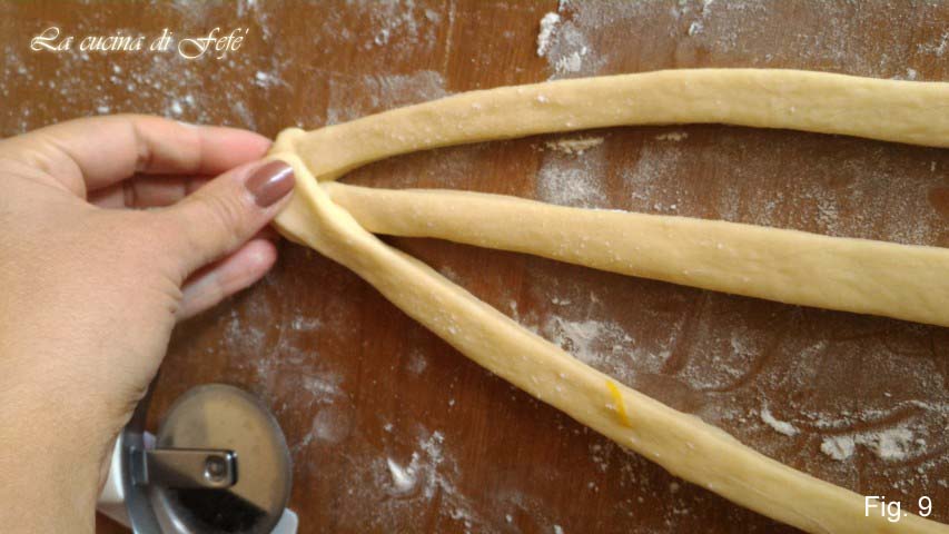 Vlecht 3 stroken tegelijk, verbind de uiteinden en verzegel ze (fig. 9).