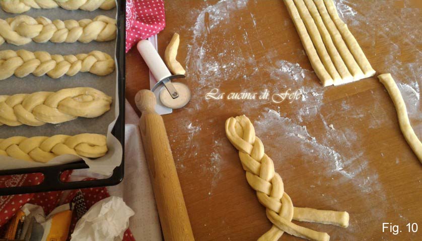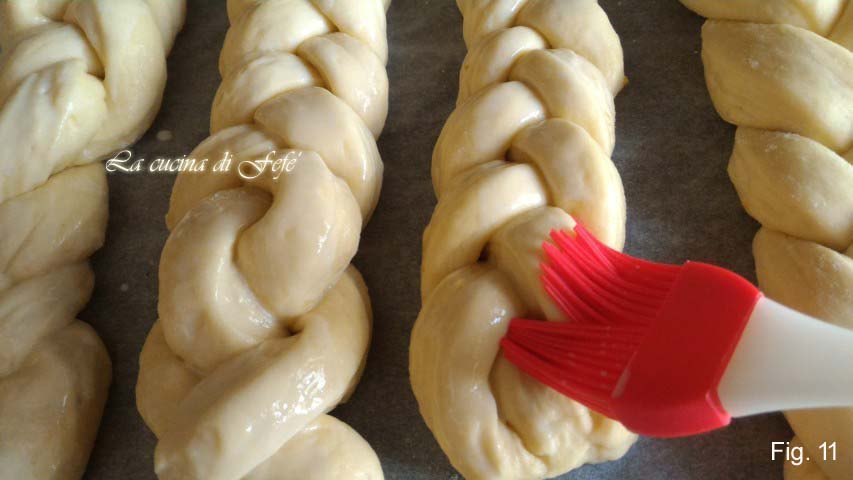 Plaats je vlechten op een bakplaat bekleed met bakpapier en laat ze afgedekt rijzen met een theedoek voor ongeveer 2 uur. Bestrijk ze vervolgens met een beetje amandelmelk met behulp van een keukenkwast (fig. 11)