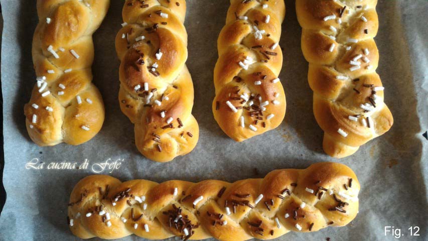 Garneer met suikergranulaat en chocoladedruppels naar wens en bak de gevlochten broodjes in een statische oven op 180°C gedurende ongeveer 18′. Zodra ze uit de oven komen, bestrijk ze met wat water om ze zowel van binnen als van buiten zacht te houden (fig. 12).