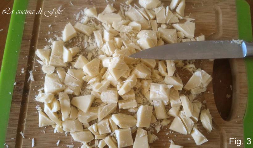 Bereid ondertussen de ganache: hak op een snijplank de witte chocolade met een mes (afbeelding 3).
