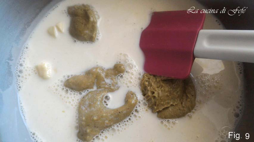 Laat het 30′ afkoelen op kamertemperatuur, zet de kom dan 30′ in de koelkast, en klop het vervolgens met elektrische gardes tot een stevige crème (afbeelding 7).