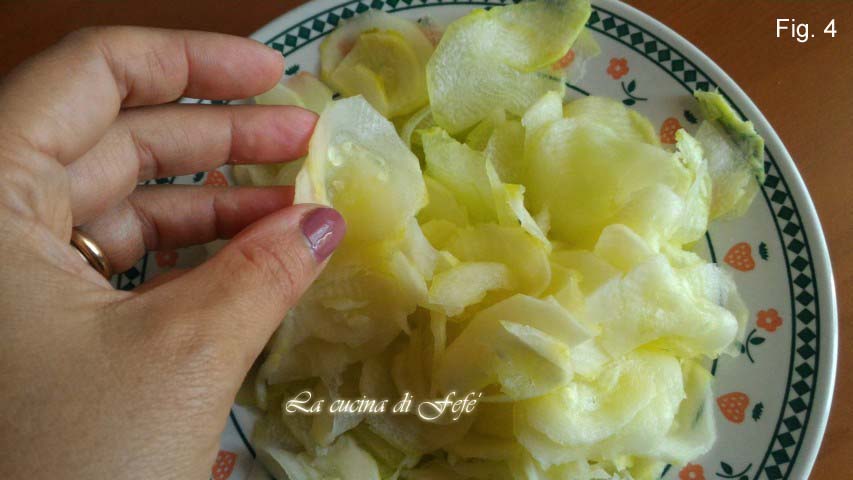 • Was intussen de courgettes en snijd de uiteinden eraf; snijd ze dun met behulp van een mandoline (fig. 4).