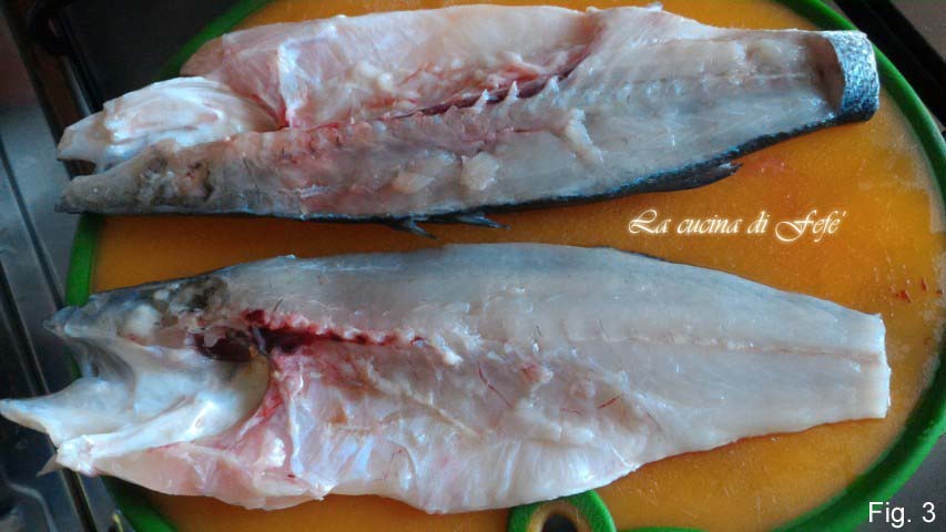 • Spoel de al gefileerde zeebaarsfilets af onder stromend water, ontdaan van ingewanden en edele resten (die je kunt hergebruiken voor het maken van een bouillon) en dep ze droog met keukenpapier (fig. 3).