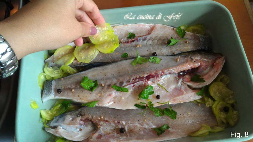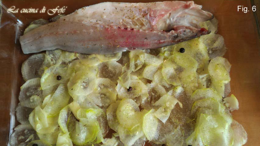 • Na de marineertijd, leg ze in een andere ovenschaal, waar je al een deel van de licht gezouten en gearomatiseerde courgettes met jeneverbes en koriander op de bodem hebt gelegd (fig. 6).