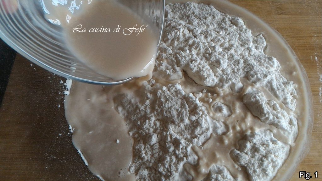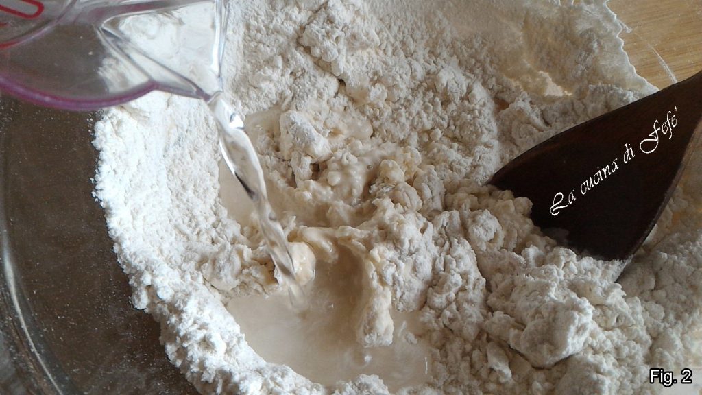 Begin met het oplossen van de gist in een beetje water van de totale hoeveelheid. Giet het in een grote kom samen met de bloem.