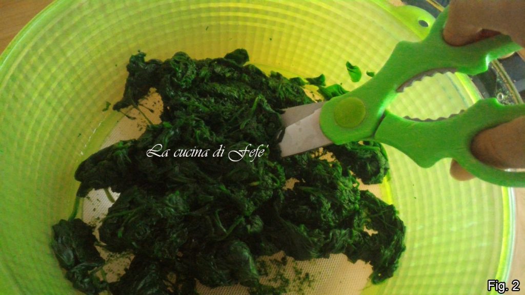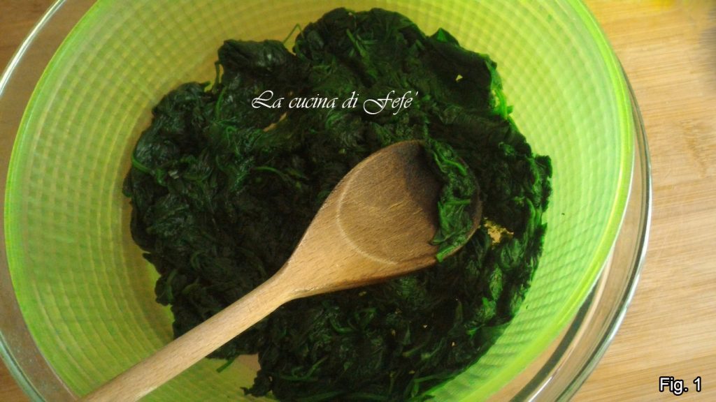 Maak de spinazie goed schoon onder stromend water, blancheer ze vervolgens 3’-4’ op laag vuur in een grote pan met alleen hun eigen vocht en bedek ze met een deksel. Zet het vuur uit en laat de spinazie uitlekken in een vergiet gedurende ongeveer 30’ of druk ze goed aan met een vork totdat al het vocht eruit is (fig. 1).