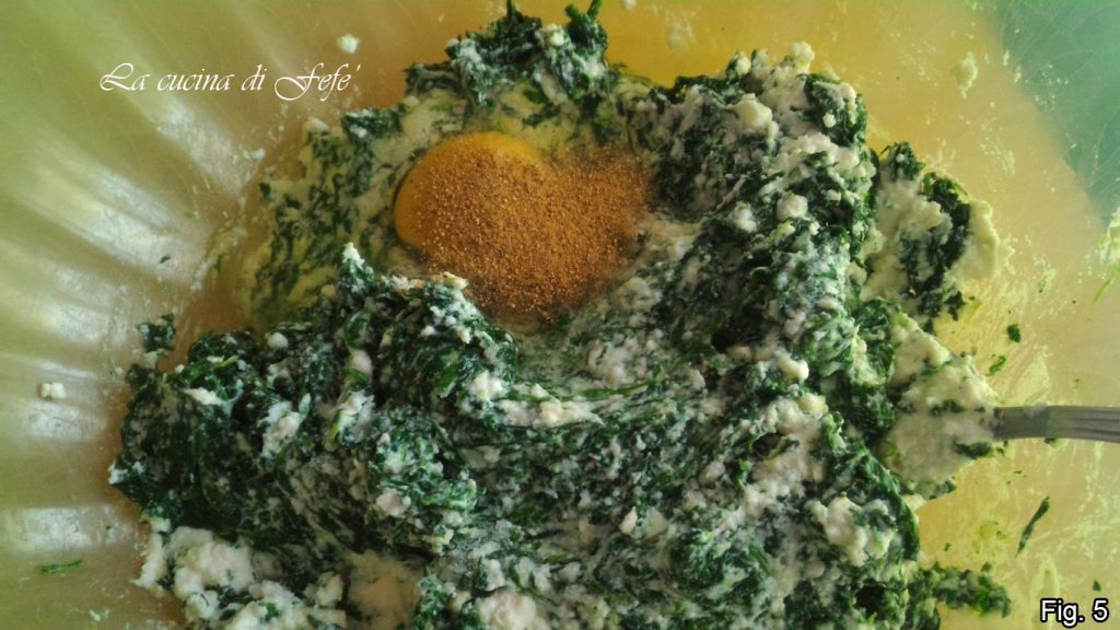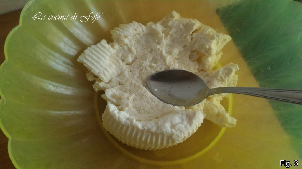 Ondertussen, in een kom, nadat je de ricotta een nacht hebt laten uitlekken, meng je het tot een crème met behulp van een lepel (fig. 3).