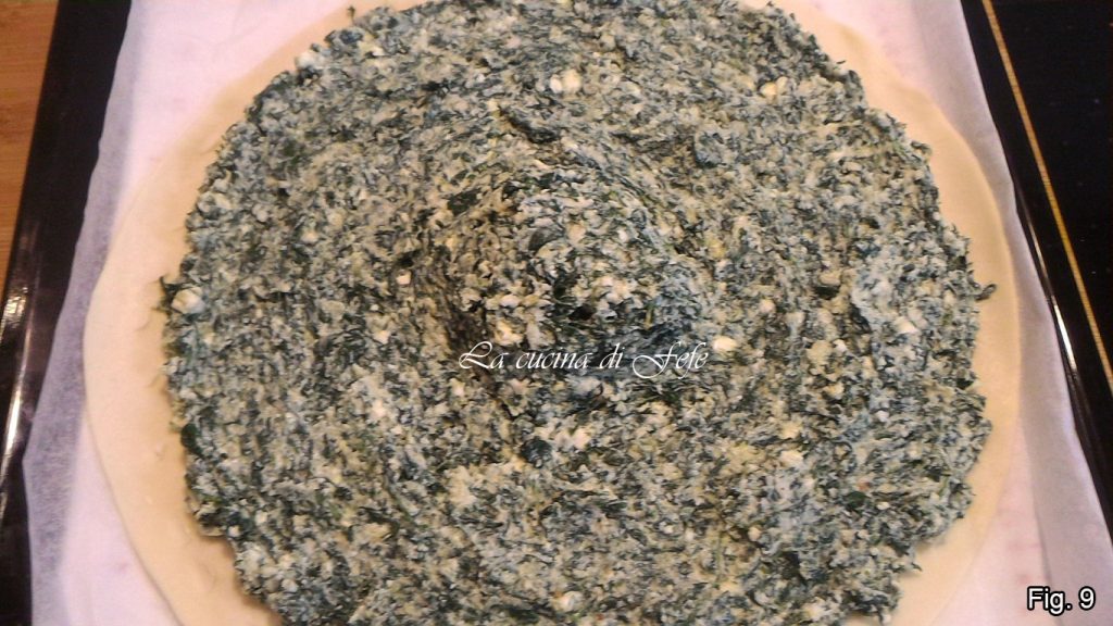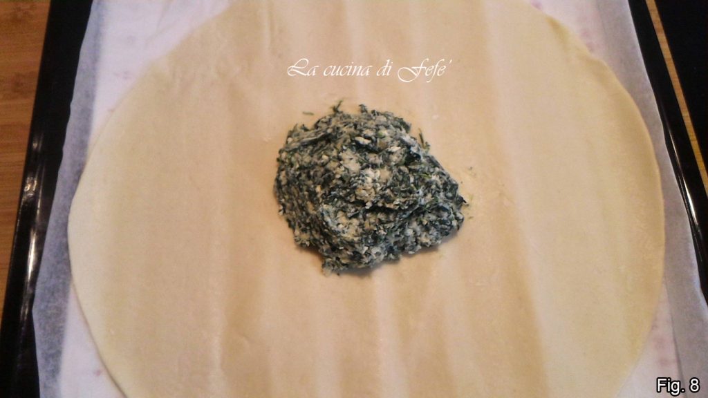 Op dit punt, op een bakplaat, rol het eerste bladerdeeg uit, laat het op het papier waarop het is verpakt en giet een mooie portie spinazie- en ricottacrème in het midden, waardoor je een kleine berg vormt (fig. 8).