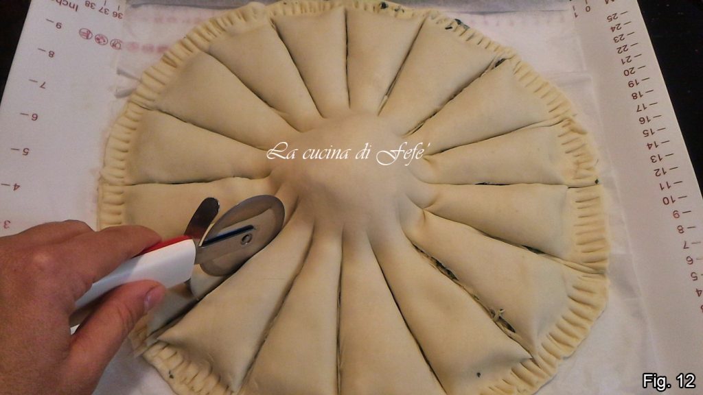 Snijd met behulp van een pizzasnijder de taart in 4 delen, laat de koepel intact, verdeel elk deel vervolgens in nog eens 4 en dan elk in tweeën om 16-18 stralen te krijgen (fig. 12).