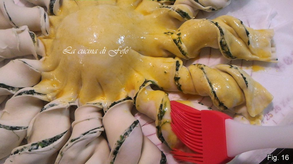 Bestrijk de hele oppervlakte van de taart met het eimengsel (fig. 16).
