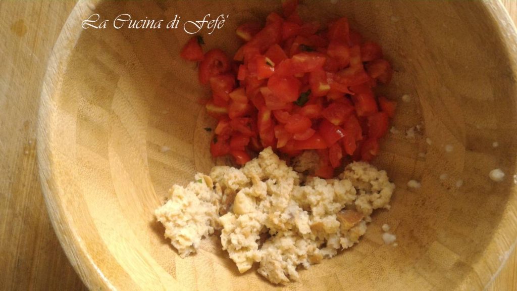 • Voeg ook de kappertjes toe die eerder ontzout zijn, de pijnboompitten, de gehakte kruiden, de caciocavallo en de olie.