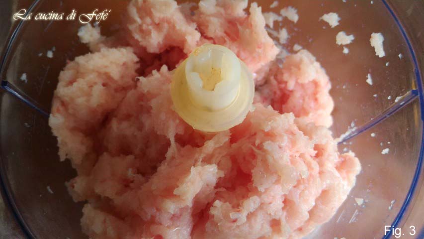 • Plaats het in een kom samen met het brood gedrenkt in een beetje melk en goed uitgeknepen, de eerder met een snufje zout losgeklopte eieren en begin met de handen te kneden, waarbij je de consistentie aanpast met wat paneermeel, maar alleen indien nodig (fig. 4).