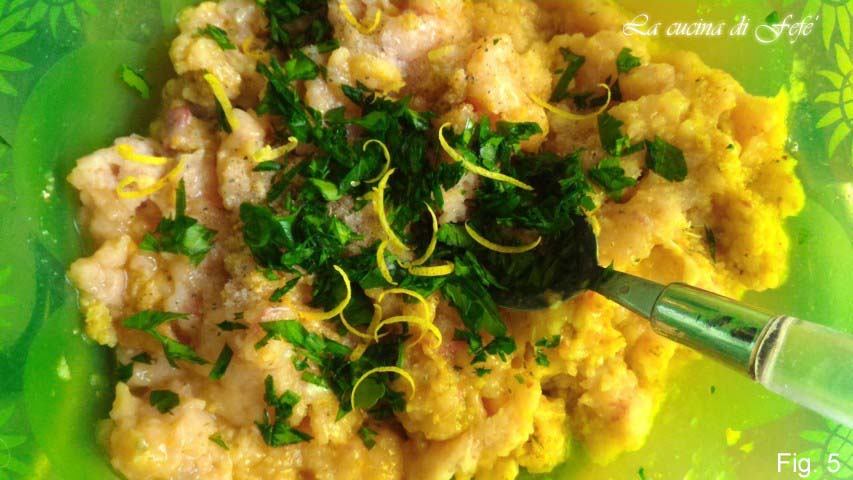 • Voeg de gehakte peterselie en de citroenschil toe, breng op smaak met zout en peper (fig. 5).