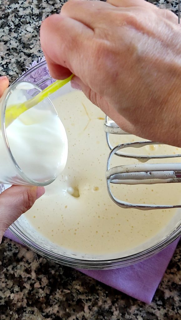 Voeg de gesmolten boter en een potje witte yoghurt toe. Meng. Ga verder met de bereiding door de geraspte schil van een halve, onbehandelde citroen, het gezeefde bloem en het bakpoeder toe te voegen. Meng.