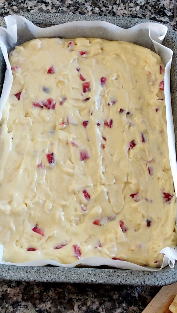Bekleed een rechthoekige bakvorm, de mijne meet 22 x 28 cm, met bakpapier of vet de vorm simpelweg in als je dat liever hebt. Giet het beslag erin en strijk het glad met de spatel.