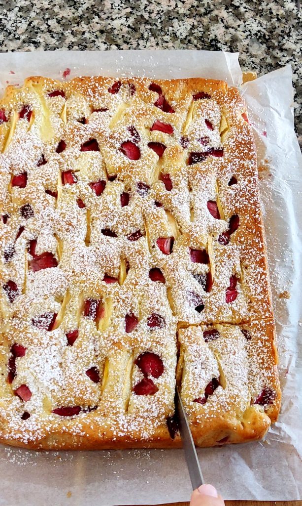 Aardbeien- en appeltaart zacht en heerlijk. De taarten met fruit zijn altijd mijn favorieten, zacht, vochtig en heerlijk. Onder mijn favorieten zijn altijd de appeltaarten en de aardbeientaarten, twee speciale vruchten in desserts. En toen dacht ik ‘waarom ze niet allebei samenvoegen?’ en zo ontstond een speciale appeltaart met veel zoete aardbeien. Een dessert dat mijn hele huis in een oogwenk vulde met zijn heerlijke geur. Een zachte taart, heel zacht en vochtig vanbinnen door de aanwezigheid van het fruit. Ik zou zeggen dat aardbeien en appels heel goed samengaan en het resultaat is een onweerstaanbaar dessert! het eenvoudige en perfecte recept om de beste aardbeien- en appeltaart te maken die je hebt geproefd en als je mijn recept volgt, is het ook heel eenvoudig te maken, zelfs voor degenen die niet veel ervaring in de keuken hebben. Laten we dan naar de keuken gaan en samen een heerlijke zachte aardbeien- en appeltaart bereiden