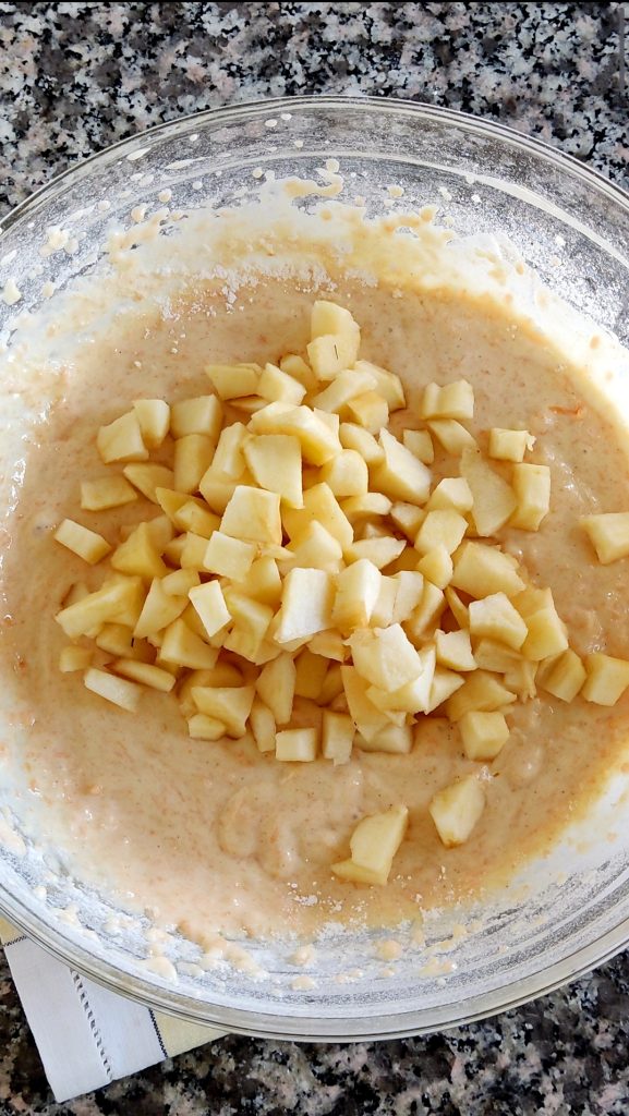 • Schil de appels, reinig ze en snijd de helft in kleine blokjes en de rest in dunne plakjes. Voeg de gezeefde bloem, het bakpoeder en de kaneel toe aan het mengsel. Roer.