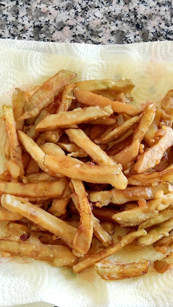 Haal de aubergines uit de olie en laat ze uitlekken op keukenpapier. Geniet ervan terwijl ze nog warm en krokant zijn.