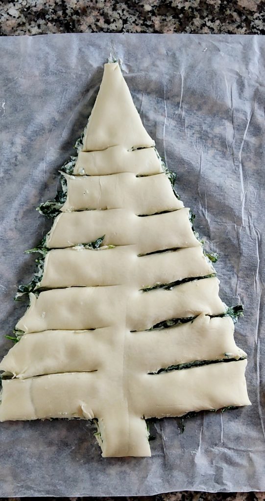 Vouw met behulp van het bakpapier de andere helft van het bladerdeeg over de vulling. Druk met de handen om de 2 delen goed te laten hechten. Nu kunt u met behulp van een liniaal een boomvorm uitsnijden. Markeer de bovenkant in het midden en maak dan twee schuine sneden zonder naar beneden te gaan.