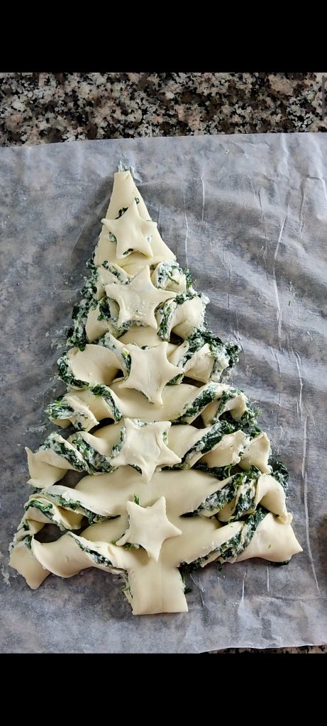 Maak nu 2-3 draaien per tak over zichzelf. Van de restjes van gevuld bladerdeeg kun je sterren maken om de Boom te decoreren, plaats er een bovenop en de andere in het midden. Bestrijk het met de melk en decoreer het vervolgens met de sesamzaadjes.