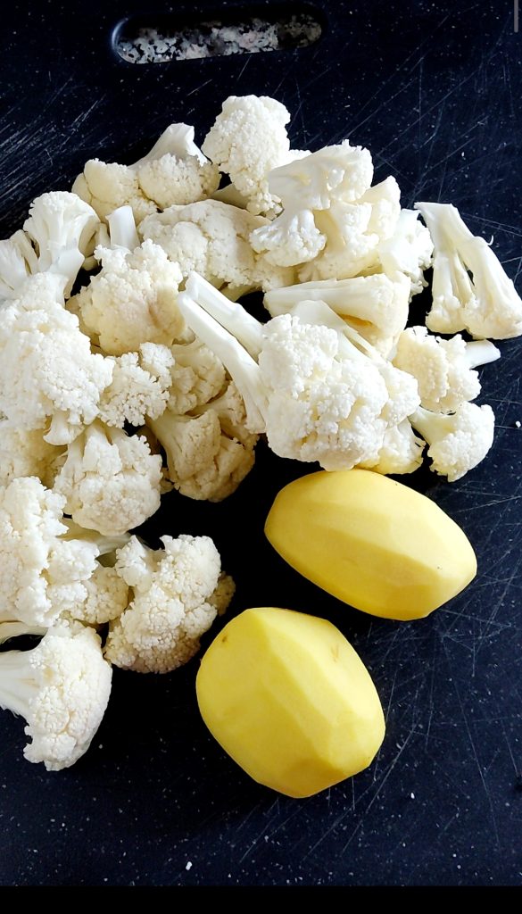 Maak de bloemkool schoon door de buitenste bladeren te verwijderen en verdeel deze in roosjes. Was en laat het uitlekken. Schil de aardappelen en was ze. Kook zowel de aardappelen als de bloemkool in kokend water. Voor de bloemkool duurt het ongeveer 12-14 minuten. Voor de aardappelen duurt het 25-30 minuten. Controleer de gaarheid van beide door ze met de tanden van een vork te prikken.