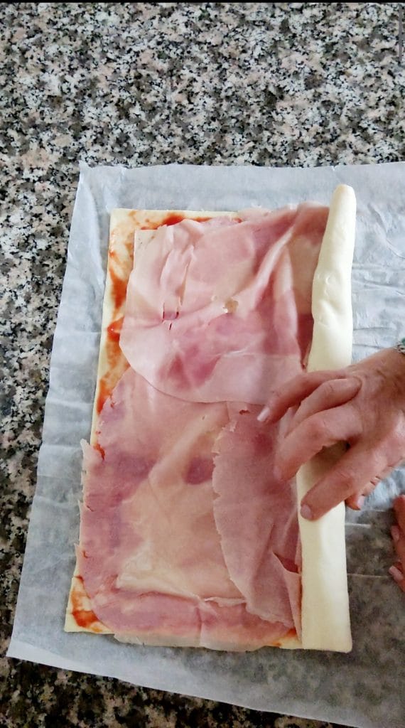 Boom van gevulde rollen met tomaat, gekookte ham en kaas. Wat is mijn Boom van bladerdeeg met pizza smaak toch schattig en lekker, heel eenvoudig en snel te bereiden. Vandaag heb ik een rechthoekig rolletje bladerdeeg eerst omgetoverd tot een gevulde rol, daarna heb ik veel rolletjes gesneden en ze uiteindelijk op een bakplaat gelegd om een heerlijke en smakelijke Boom van gevuld bladerdeeg te vormen. Een perfect voorgerecht voor de komende feestdagen dat familie en vrienden zal verbazen en verleiden met smaak en heerlijkheid. Vindt u het niet ook perfect als een eettafel decoratie die langzaam gegeten kan worden? Ik raad u aan ook het recept van mijn Rustiek boom van bladerdeeg te lezen. U kunt het van tevoren bereiden en zonder het te bakken in de koelkast bewaren, of u kunt het invriezen om het al klaar te hebben, enkel voor een paar minuten op te warmen in de oven of nog korter in de magnetron. Heb ik u al overtuigd om het te proberen? Laten we dan de keuken in gaan en samen de Boom van bladerdeeg rollen bereiden