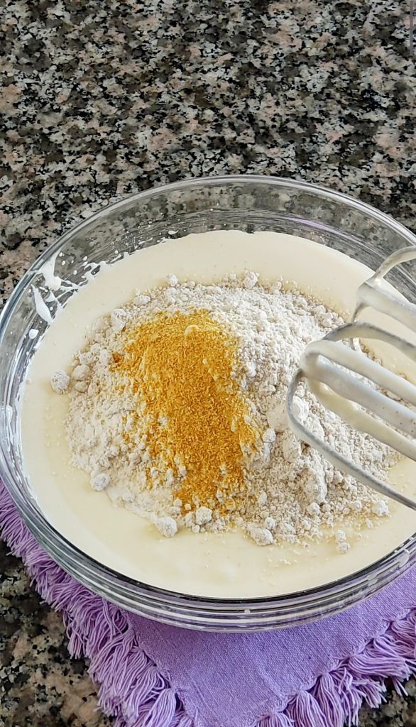 Ga verder door de geraspte schil van een halve sinaasappel en het bakpoeder toe te voegen. Meng goed.