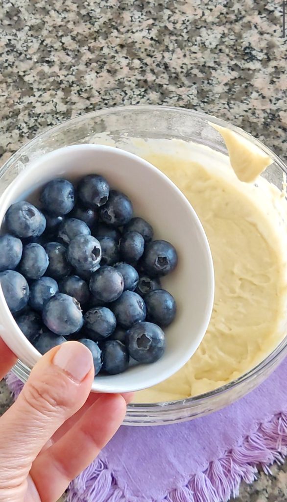 Voeg als laatste de bosbessen toe aan het beslag en meng eenvoudig met een spatel om ze door het beslag te mengen.