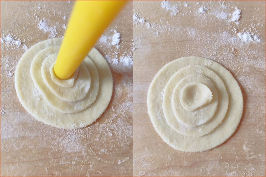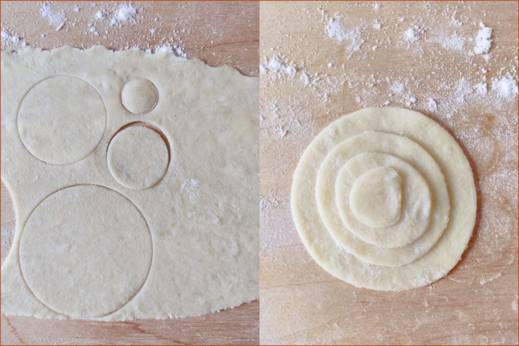 Gebruik vier ronde uitsteekvormpjes van verschillende groottes om schijven uit te snijden. Leg vier schijven deeg van afnemende grootte op elkaar en druk met de steel van een houten of siliconen lepel in het midden. Op deze manier zullen de deegschijven in het midden aan elkaar kleven.