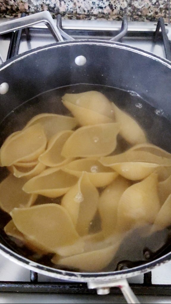 Terwijl de pompoen kookt, kook ook de pasta. Kook de Conchiglioni in ruim gezouten water waarin je ook een eetlepel olie hebt toegevoegd om te voorkomen dat ze aan elkaar plakken. Laat ze ongeveer 12-14 minuten koken of de tijd aangegeven op de verpakking van de pasta die je gebruikt. Giet ze voorzichtig af en leg ze op een keukendoek om uit te lekken en af te koelen.