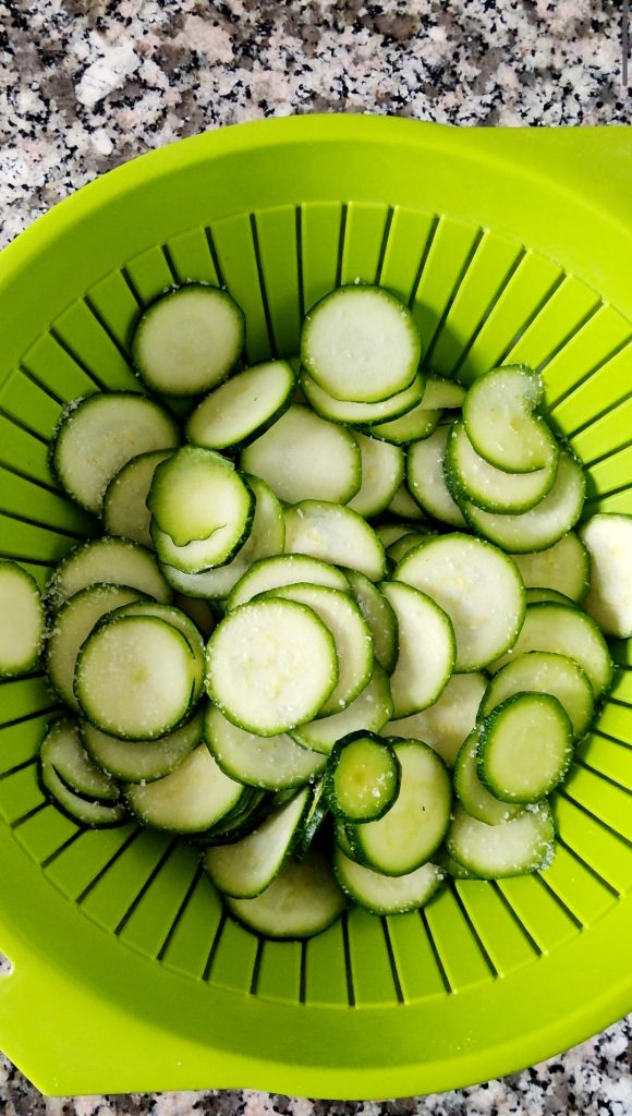 Als je haast hebt, kun je de stap van de courgettes onder het zout overslaan en direct doorgaan met de bereiding.