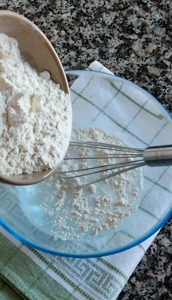 Bereid het beslag. Doe de bloem in een kom, voeg beetje bij beetje het water toe terwijl je blijft roeren met een garde.