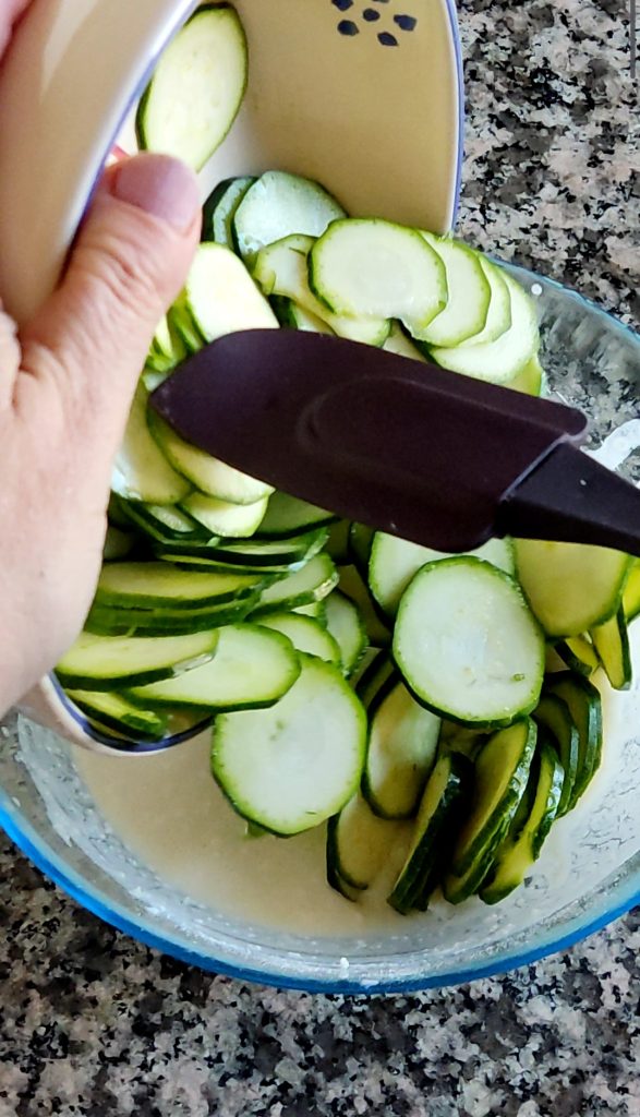 Voeg de plakjes courgette toe aan het beslag en roer met een spatel om ze goed te mengen.