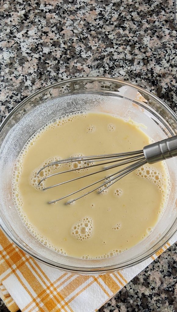 Giet het kikkererwtenmeel in een kom. Voeg beetje bij beetje het water toe terwijl je blijft kloppen met een garde om klontjes te voorkomen. Dek de kom af met plasticfolie en laat het deeg 2 uur of langer rusten.