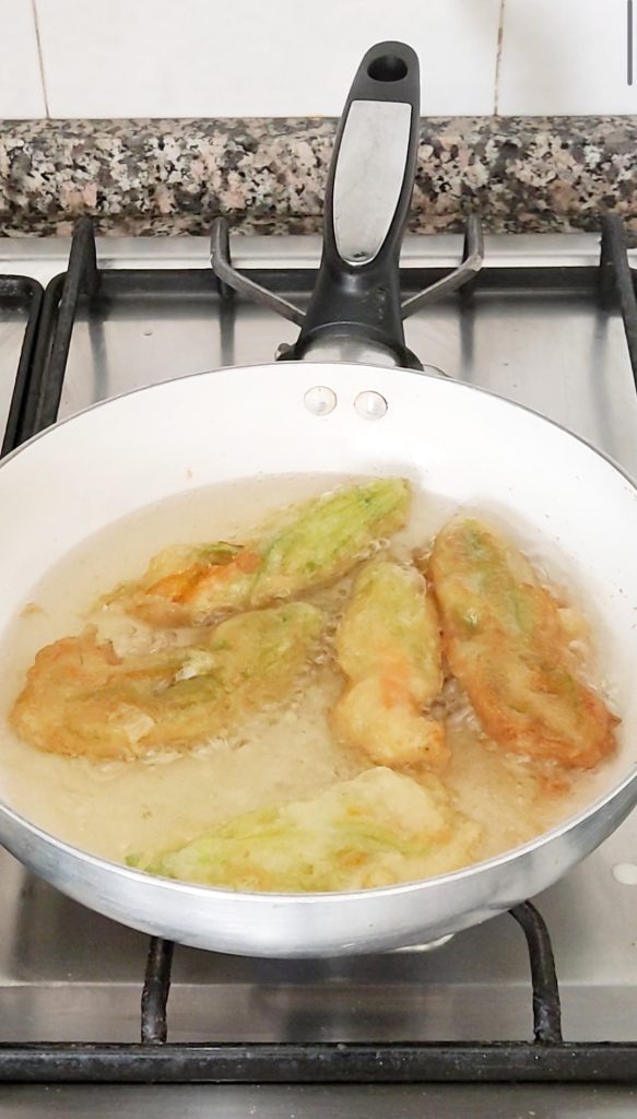 Verhit voldoende maïsolie in een kleine, diepe pan. Dompel de gevulde bloemen in het beslag en dompel ze daarna in de hete olie.