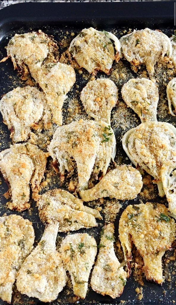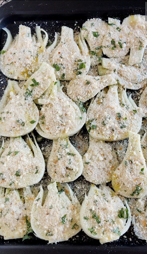 Giet een beetje extra vergine olijfolie over de bovenkant. Verdeel het paneermengsel over de venkelplakjes.