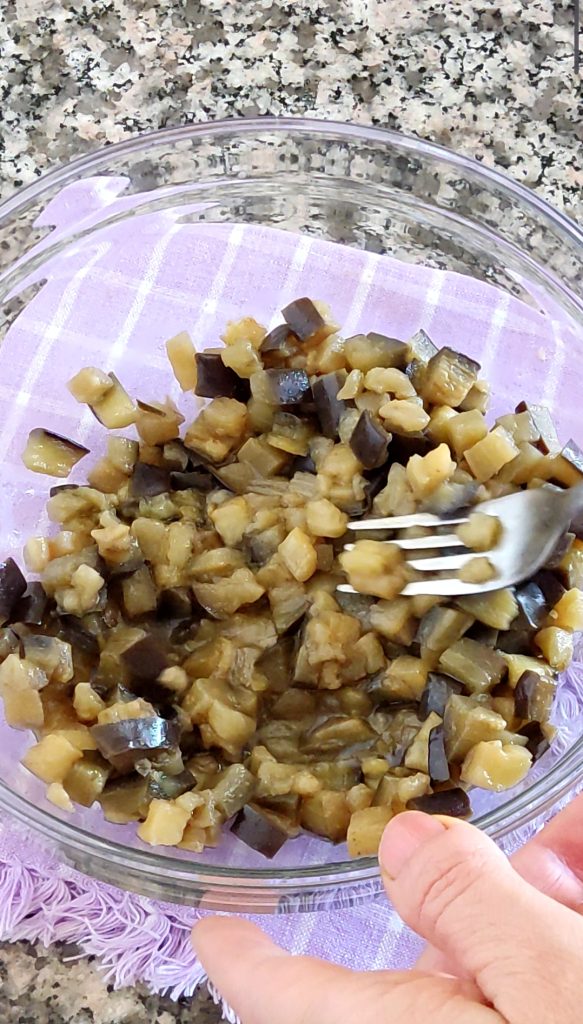 Laat de aubergines op middelhoog vuur 8-10 minuten koken, vaak omroerend met een houten lepel. Verwijder de knoflook en laat ze afkoelen. Doe de aubergines in een kom en prak ze eenvoudig met een vork, ze hoeven niet volledig geplet te worden