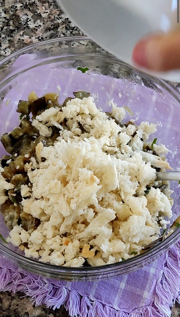 Voeg een ei toe en het broodkruim in kleine stukjes. Meng met een vork.