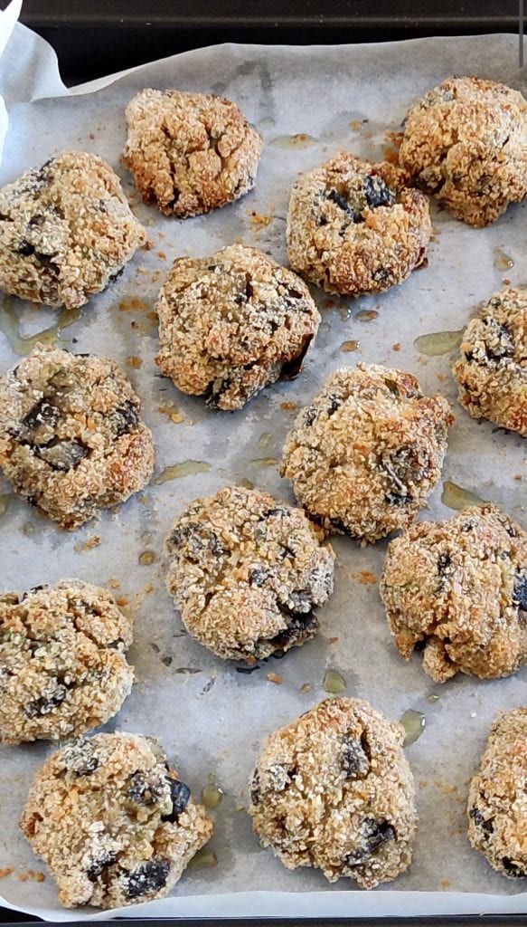 Leg de gehaktballetjes met aubergines op een met bakpapier beklede bakplaat. Voeg een scheutje extra vergine olijfolie over de bovenkant toe.