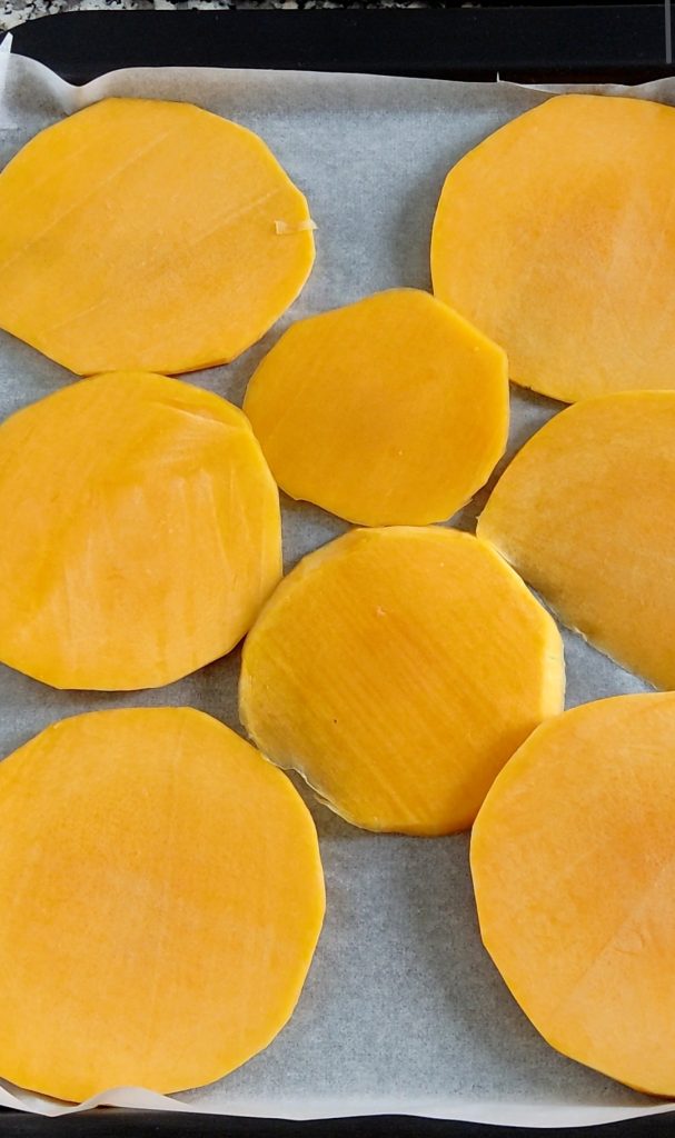 Voor dit recept heb ik een lange pompoen gebruikt zodat ik ronde plakjes kreeg, maar je kunt ook een ander type pompoen gebruiken als je dat liever hebt. Snijd de pompoen in plakjes en verwijder de schil en eventueel zaden en draden aan de binnenkant.
