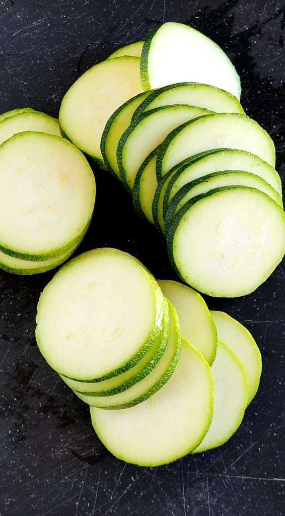 Voor dit recept heb ik grote courgettes gebruikt, maar je kunt ook middelgrote courgettes gebruiken en ze misschien in de lengte doormidden snijden. Was de courgettes, snijd de uiteinden eraf en snijd ze in dunne plakjes.