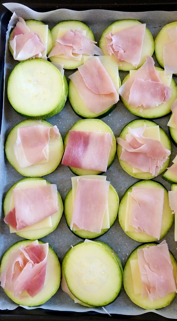 Leg de helft van de courgetteplakken op een met bakpapier beklede bakplaat en zout ze lichtjes. Leg op elke plak een plakje kaas en vervolgens een plakje gekookte ham. Sluit af met een andere plak courgette en druk licht aan.