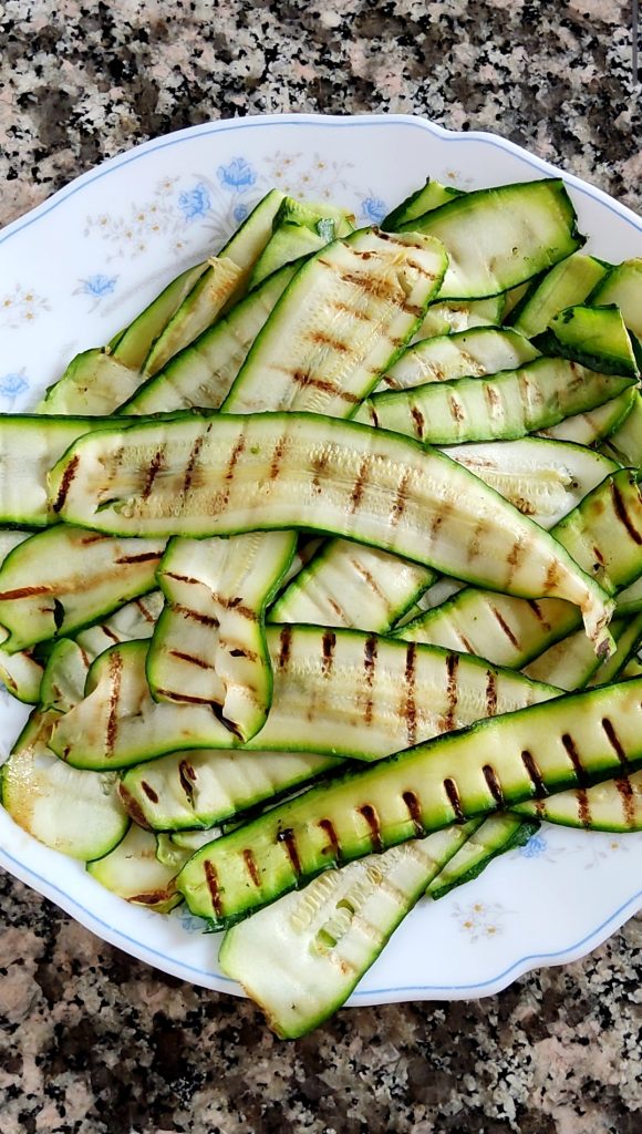Was de courgettes, snijd de uiteinden eraf en snijd ze met behulp van een dunschiller in zeer dunne plakjes in de lengte. Grill de courgetteschijfjes op een grillplaat. Schil de aardappelen, was ze en snijd ze in zeer dunne plakjes.
