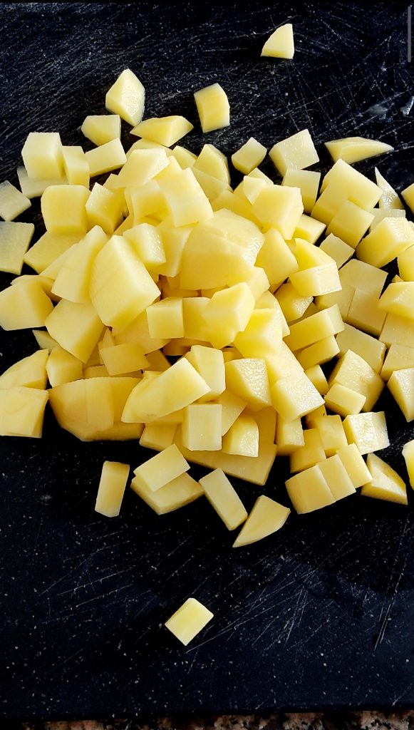 Schil de aardappelen, was ze en snijd ze in blokjes. Laat de aardappelen koken in gezouten kokend water gedurende 20-24 minuten. Test de gaarheid door erin te prikken met een vork. Giet ze af. Maak de pompoen schoon en snijd deze in kleine blokjes.