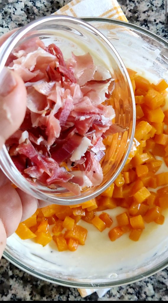 • Voeg de gekookte pompoen aan het deeg toe nadat je het teentje knoflook hebt verwijderd. Voeg nu de speck, de scamorza en een snufje peper toe. Meng goed met een spatel om alle ingrediënten in het deeg te mengen.