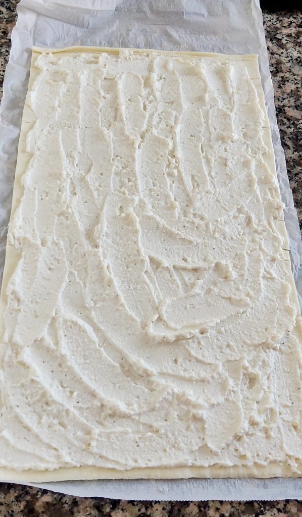 Rol een rechthoekige rol bladerdeeg uit op het werkblad. Verspreid de ricottacrème over het hele oppervlak